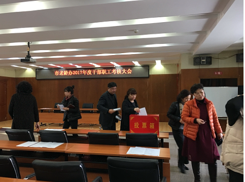 3月1日下午,市老龄办在五楼会议室召开2017年度干部职工考核大会,对办机关工作人员及工勤人员进行考核等次评定,会议由老龄办副主任孙凤龙主持,办机关全体干部职工参加会议。