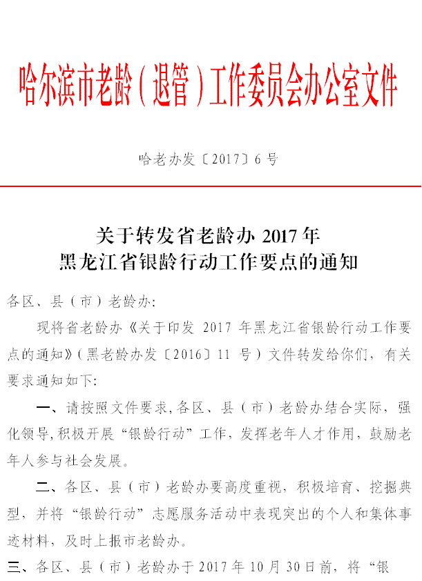 关于转发省老龄办2017年黑龙江省银龄行动工作要点的通知
