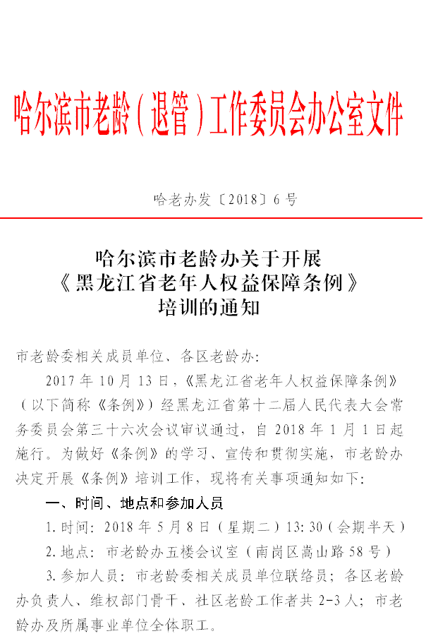 哈尔滨市老龄办关于开展《黑龙江省老年人权益保障条例》培训的通知